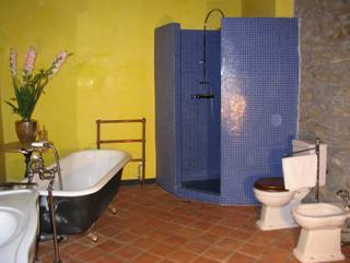 Stahlwanne, WC, Bidet und einer großen halbrund gemauerten Bisazza Dusche ausgestattet. |